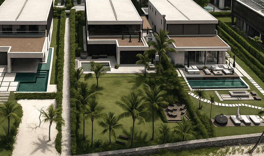 Vilas residenciais, marina, campo de golfe, spa, boulevard de lojas e serviços hoteleiros pay-per-use